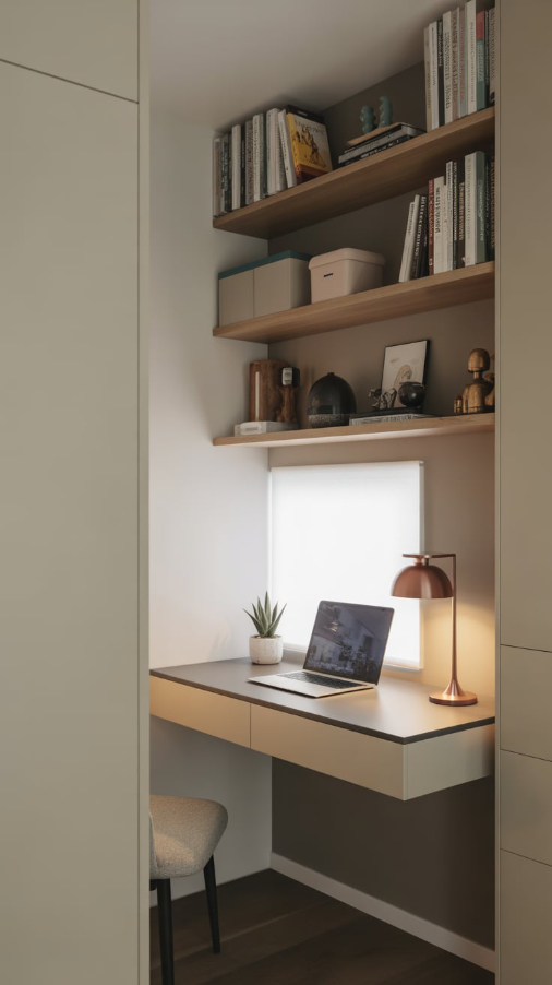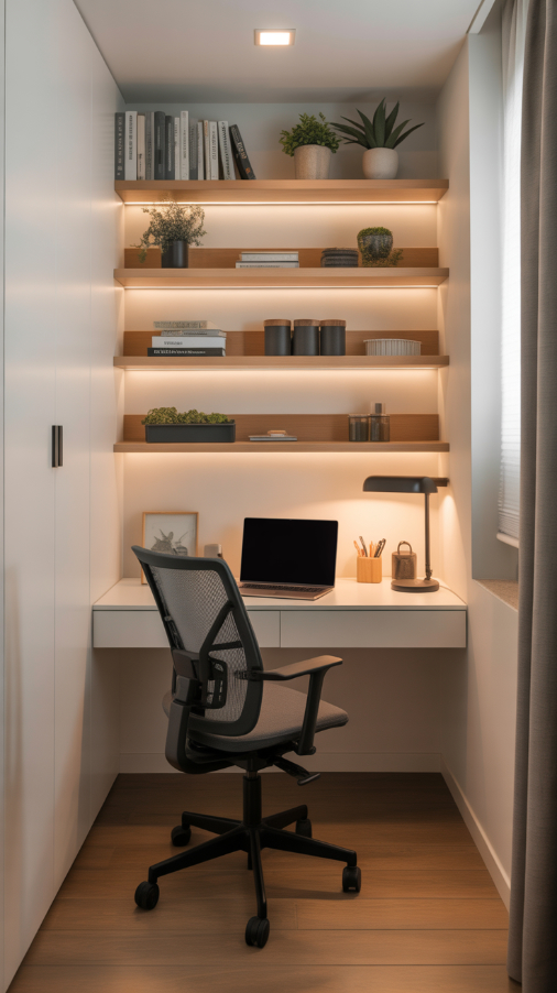 - Cloffice setup—turn a closet into a micro office with shelving and a desk surface.